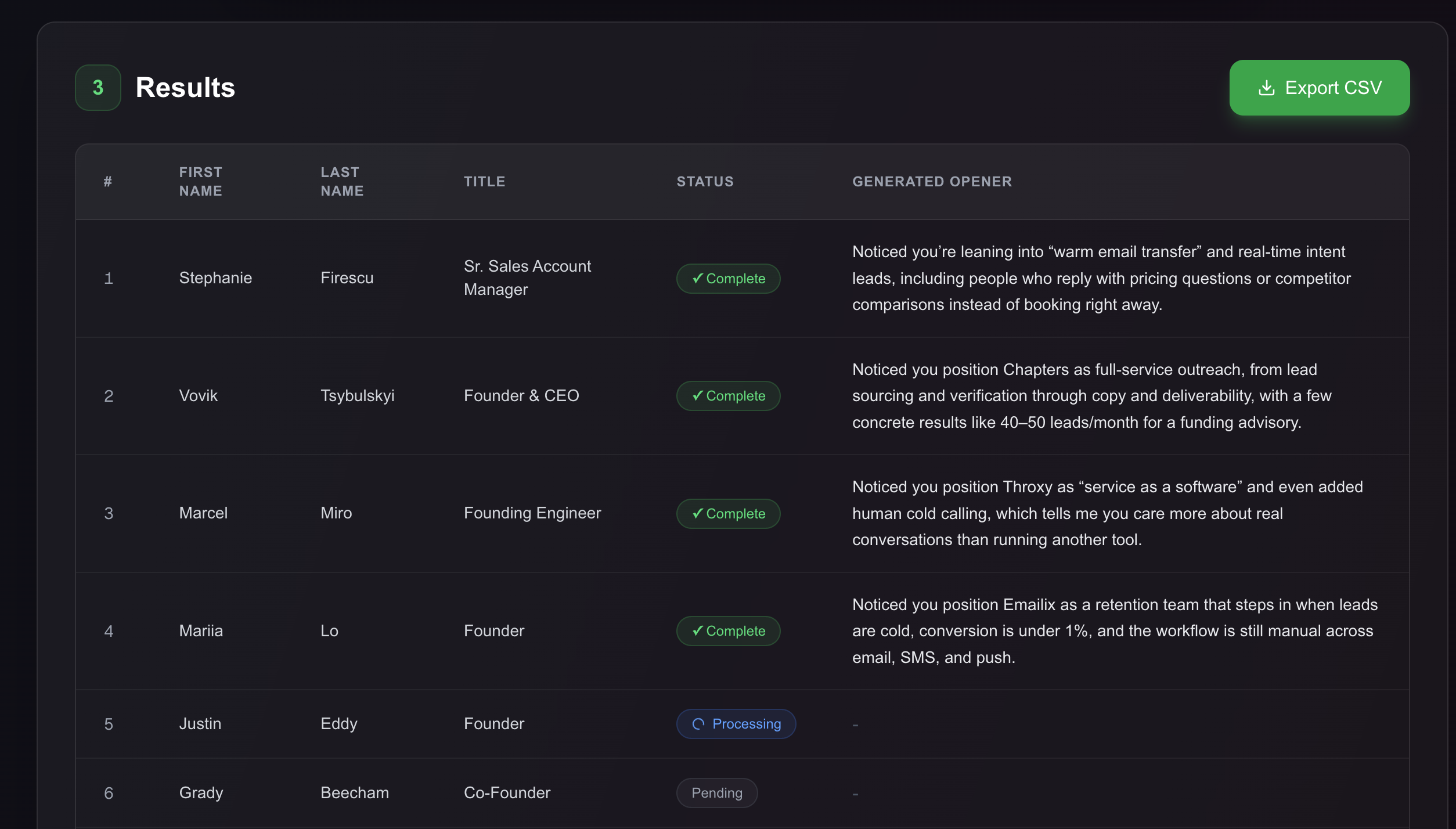 Download your completed CSV with personalized, ready-to-send openers for each prospect.
